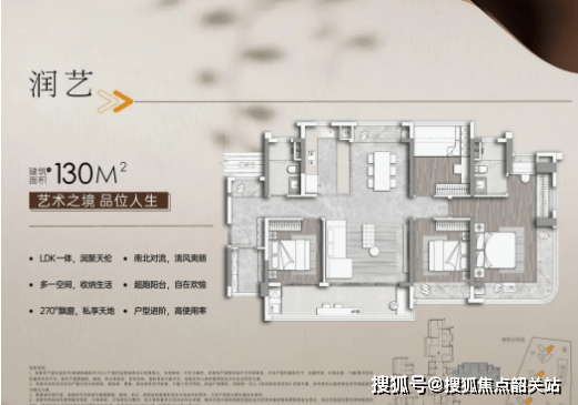 建面约130㎡东南阔景4+1房:东南向布局,采光充足,视野开阔,可俯瞰社区园林美景。户型采用横厅设计,客餐厅一体化,空间感十足,适合家人聚会和朋友宴请;4+1房设计,灵活多变,可根据家庭需求改造成书房、儿童游乐室等功能空间,提升空间利用率;主卧套间配备独立卫浴、衣帽间和观景飘窗,舒适度极高;其他卧室均带飘窗,拓展了使用空间,也提升了居住的舒适度。