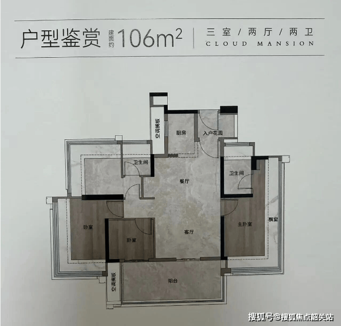 建筑面积约一百零六平方米的四房户型,空间更为舒展。南向双阳台的设计是其一大亮点,一个阳台用于景观观赏,另一个阳台用于日常家政晾晒,功能分区明确,互不影响。主卧和一间次卧配备了L型大飘窗,极大地扩展了室内的视觉空间和采光面。另一间次卧与阳台相连,通透性极佳。这款户型的采光和通风效果都十分出色,居住舒适度极高。