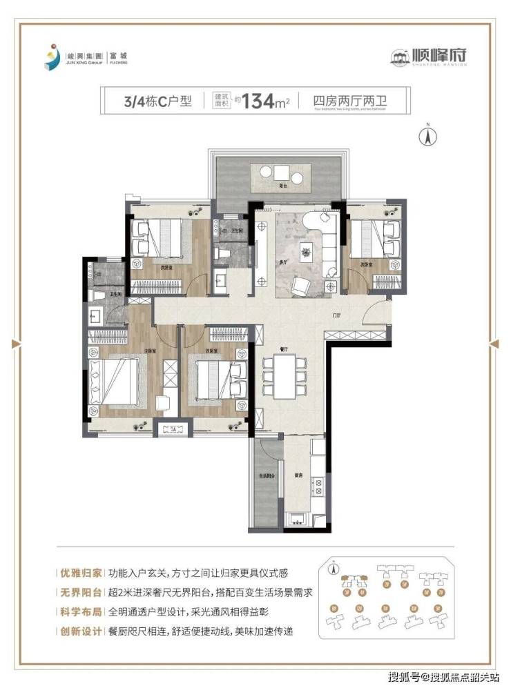 面积段与得房率:建面约134㎡,得房率约81%,实际使用面积约108.5㎡,四房设计,空间宽敞无压力,精准适配三代同堂、三胎家庭,满足多人口家庭的居住需求,实用性拉满。