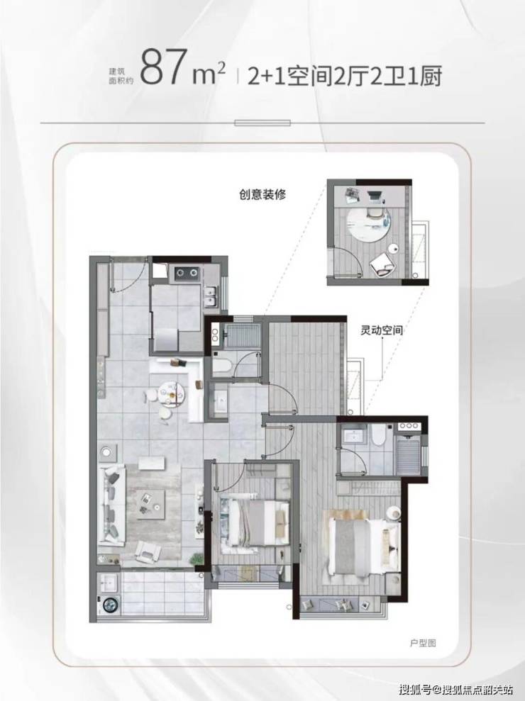 87㎡户型:做到了极致的三房两卫,总价约210万起,是刚需进阶的首选。