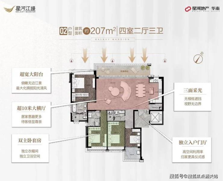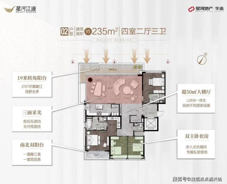 星河江缦的产品力是其核心竞争力所在,项目在设计上充分融合了现代美学与实用功能,打造出令人惊艳的居住空间。主力户型面积段为179㎡至235㎡,全部采用双套房设计,确保了主卧与次卧的独立性与私密性。特别是5栋的235㎡户型,作为项目主推户型,货量极少,仅30套,距离江边仅90米左右,拥有绝佳的江景视野。所有户型均采用LDKB一体化设计(客厅、餐厅、厨房、阳台一体化),极大地拓展了空间的视觉尺度,让室内与室外自然融合。超宽大的阳台设计,不仅增加了采光面,更为业主提供了晾晒、休闲、观景的多功能空间。