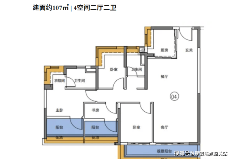 建面约107㎡四房两厅两卫 该户型为刚需向改善户型,建面约107㎡,打造四房两厅两卫格局,高赠送设计,得房率超100%,在有限空间内实现四房布局,满足四口之家或三代同堂的居住需求。客厅、主卧、两个次卧均朝南,全明通透,采光通风俱佳。 主卧配备独立卫生间和衣帽间,私密性与舒适性兼具;书房空间灵活,可根据需求改为儿童房或客房;阳台宽阔,可俯瞰社区园林景观,日常休闲、晾晒十分便捷;动静分区明确,公共区域与私密区域互不干扰,居住体验极佳。