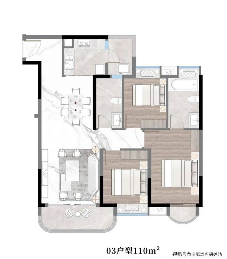 03户型:约110㎡,三房两厅两卫带主套