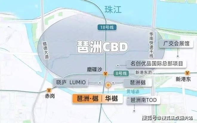最近的地铁,还是琶洲西区最核心、8/18号线双线交汇的磨碟沙地铁站,仅隔着一条新港东路,直线距离约200米。