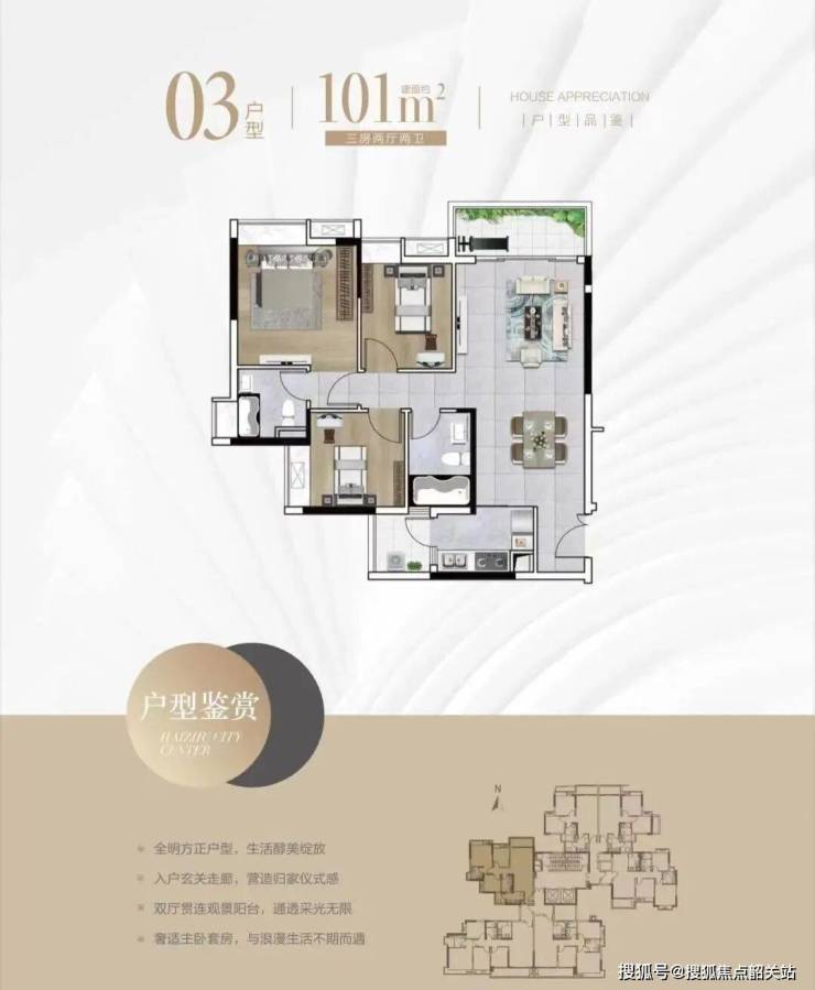 住宅只有1栋,26层高,2梯6户;减去1-5层的商业、公建配套等,住宅货量也就120多套,准现楼,建面约75-129㎡共5种户型全部做了实体样板间。