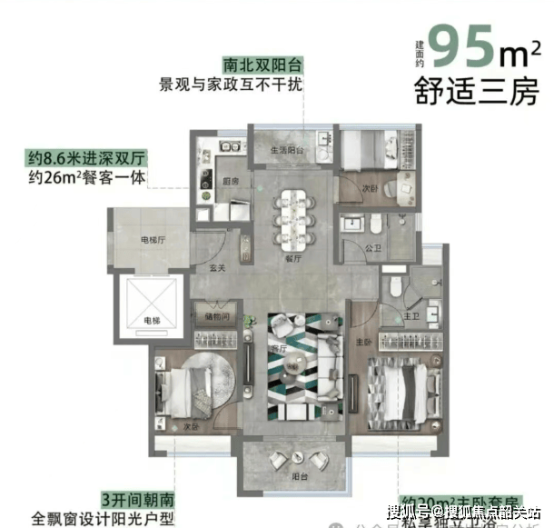 95㎡三房:小高层与超高层均有布局,适合年轻家庭首置或改善;