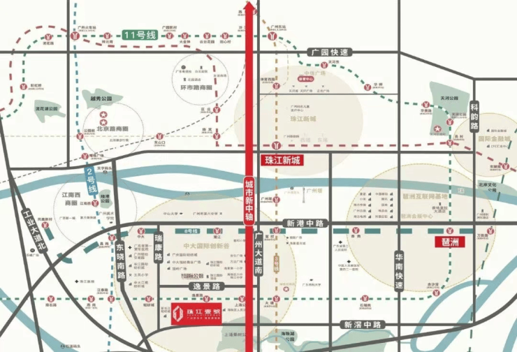 珠江壹号占据广州城市发展主动脉,为地铁11号线逸景路站正上盖物业,负一层直连地铁站厅。作为广州首条环线地铁,11号线串联天河、越秀、荔湾、白云、海珠五大中心城区,高效接驳城市核心资源。从项目出发,仅5站即可抵达珠江新城CBD或琶洲会展商务区,通勤效率显著优于传统住宅板块。随着11号线全面运营,区域人流、商流价值将进一步释放。