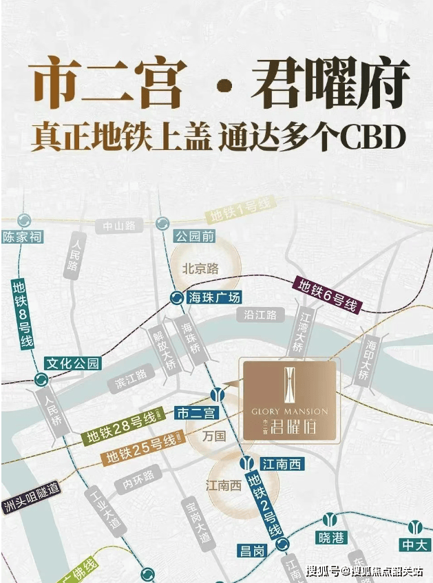君曜府位于地铁2号线和28号线(广佛段在建中)交汇的市二宫站上盖,交通出行非常便捷。周边还有江南大道、内环路、滨江路等主干道,公交线路密集,便于居民快速通达各区。未来,随着28号线的开通,从市二宫站出发,可以更快捷地到达琶洲、广佛莞三市中心城区等地。