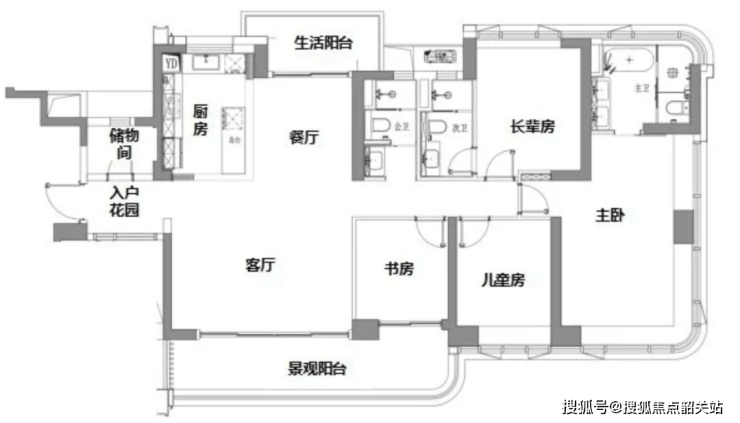 143㎡四房两卫:空间更加阔绰,生活阳台与景观阳台相呼应,增加了空间的通透感。主卧套房设计,配备独立卫生间和储物间,保障主人的私密性和舒适性。