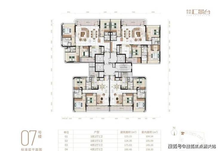 主力户型面积介于123-352㎡之间,涵盖了从三房到五房的多样化选择。每个户型都注重实用率,达到了82%-84%的高水平。以123平米的三居室为例,其巧妙的空间布局使得每一个房间都能获得充足的自然光线,同时客厅与餐厅相连形成宽敞的公共活动区域,非常适合现代家庭的生活需求。