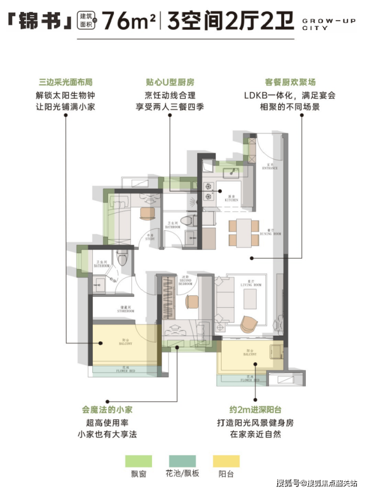 越秀大学星汇锦城户型设计注重实用与舒适的结合,95%以上户型均为南向布局,确保采光充足和通风良好。主力户型从约七十六平方米的三房至九十八平方米的四房不等,均配备宽敞阳台,部分户型实现三开间甚至五开间朝南,最大限度提升居住舒适度。内部空间采用开放式厨房与客餐厅一体化设计,方便家庭互动。大尺度阳台设计满足多种生活需求,包括休闲、种植及宠物活动。独特的270度转角阳台和超长采光面,更加突显豪宅品质。