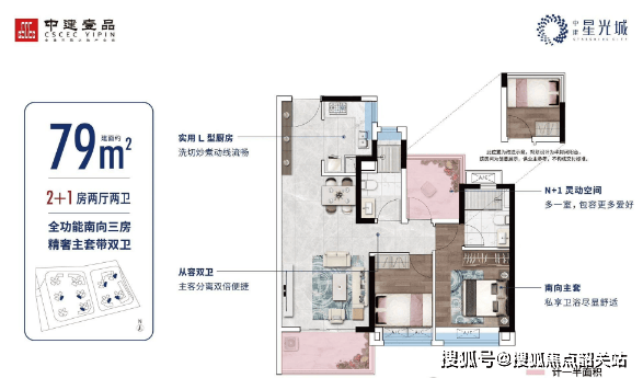 建面约79㎡主套双卫3房:东南向瞰园林,带主套的双卫设计,空间布局合理,通风采光俱佳。