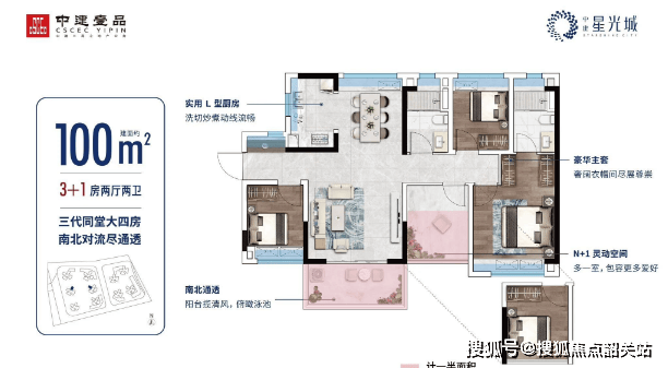 建面约100㎡会呼吸的大4房:四开间朝南,南向大阳台,三代同堂的理想之选。