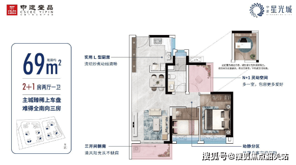 建面约69㎡南向三房:三开间朝南,采光极佳,阳台开间达3.2米,实用率高达94%。