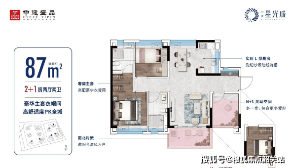 建面约87㎡南北通透大3房:纯南向通透三房,半附加多功能房,生活更多想象空间。