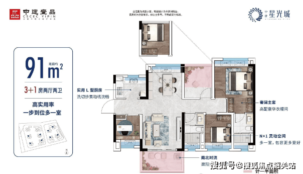 建面约91㎡南北通透4房:宽敞通透,适合大家庭居住,实用率高达约96%。