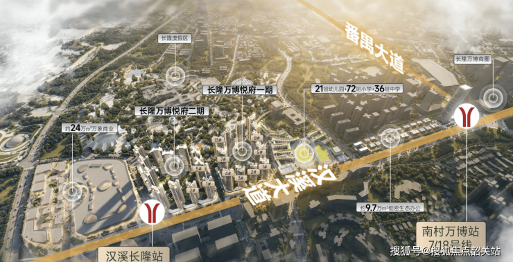 项目距离地铁3号线和7号线交汇的汉溪长隆站步行约500米,早高峰打车到珠江新城大约25分钟。更难得的是,二期住宅几乎下楼即达地铁口,18号线南村万博站也在1.2公里范围内。这意味着无论是通勤天河、琶洲,还是前往广州南站搭乘高铁,出行效率都相当高。周边主干道汉溪大道虽偶有拥堵,但整体路网密度优于番禺多数板块。