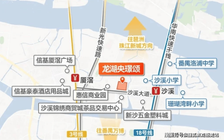 地铁18号线沙溪站距项目600米,1站达万博,2站到琶洲,3站至珠江新城;