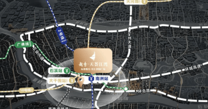 拥有便捷的交通网络,三大地铁环绕。2 号线南洲路站、广佛线石溪站距离项目均约 1000m(百度地图测量),10 号线大干围站(在建中)距离项目约 800m(百度地图测量),未来 5 站即可到达南站。此外,距内环路入口仅 1.3 公里(百度地图测距),驾车可直连广州主城大动脉,畅达广州各大核心区域。