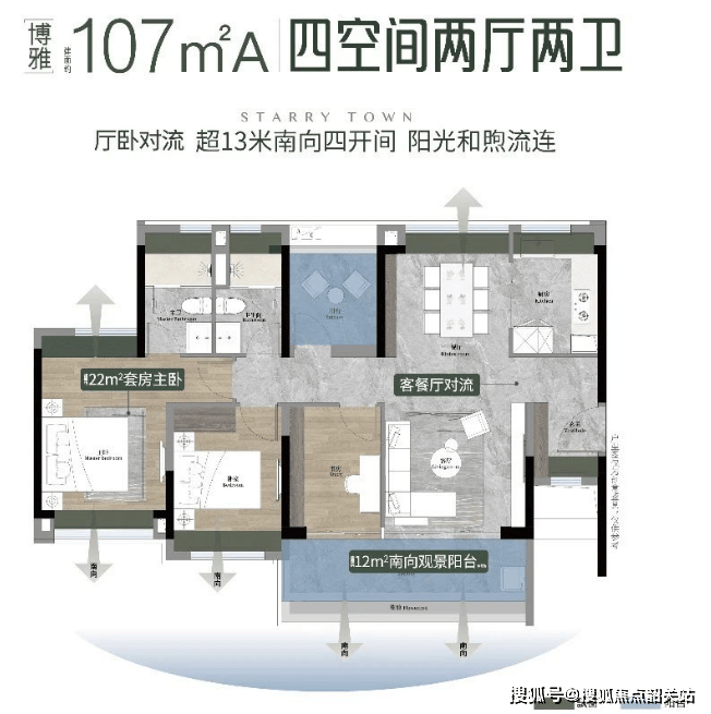 107平方米A户型四房两厅两卫:4.5开间朝南,客厅主卧南北对流,5.9米长观景阳台。