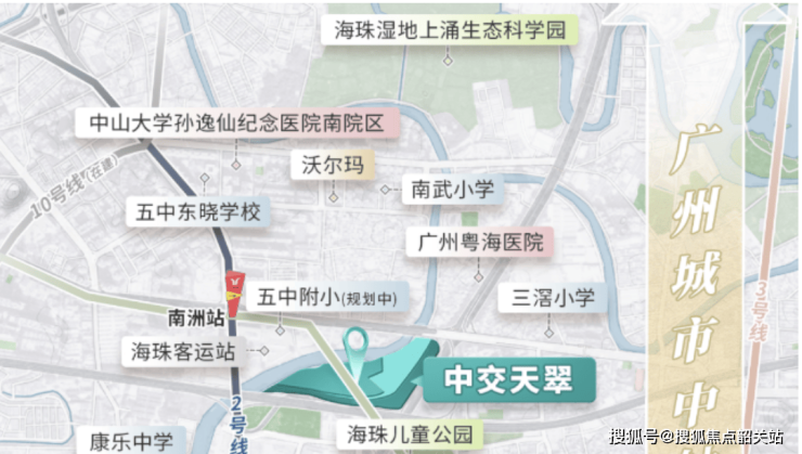 中交·天翠交通条件优越,距离地铁2号线和广佛线交汇的南洲站约500米,居民可便捷换乘至珠江新城、琶洲及万博CBD,轨道交通覆盖率高,自驾出行同样便捷。项目毗邻广州大道及环城高速,快速连接全城主干道网络,前往珠江新城、天河及琶洲商务区均在半小时内可达。交通设计兼顾便捷性与日常生活通行效率,同时考虑地块被主干道包围可能带来的噪音和粉尘影响,整体交通条件对于商务出行和日常生活均具优势。