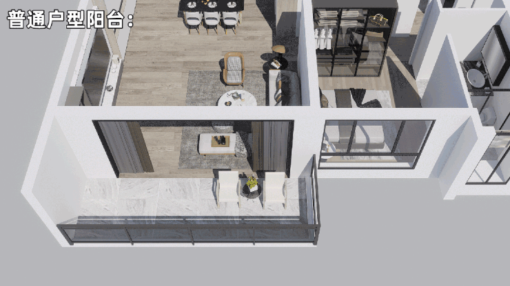 景观阳台尺度提升到面宽近9米,进深约2.4米。延长阳台拓宽套房,更能满足小孩年岁增长后,对私域空间愈发强烈的渴求。