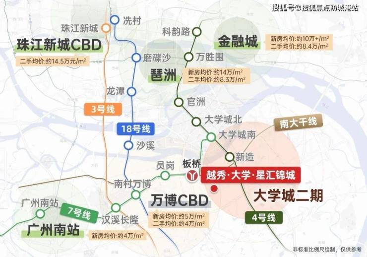 越秀星汇锦城坐落于广州番禺区南村镇兴南大道与南大干线交汇处,占据万博CBD扩容区与广州国际科技创新城双重战略节点。项目北接万博商务区(直线距离3公里),南邻广州南站交通枢纽(10分钟车程),西望长隆旅游度假区,东连暨南大学番禺校区,形成"15分钟产城融合生活圈":