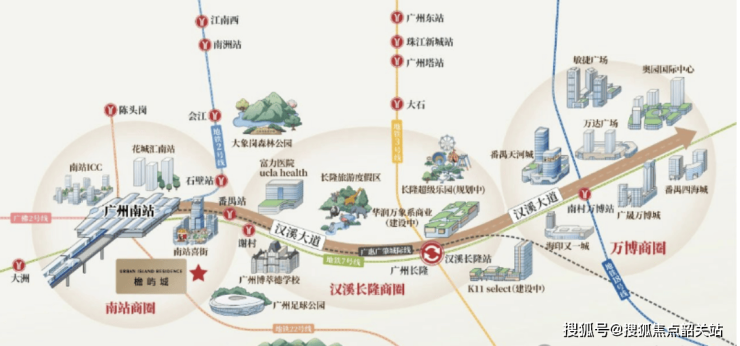 万科·檐屿城坐落于广州南站商务区核心,交通资源极其丰富。项目紧邻地铁2号线、7号线、22号线以及广佛地铁2号线,居民步行至地铁站仅需五分钟,地铁线网能便捷直达珠江新城、万博等重要CBD,提升了日常通勤的便利性。此外,项目周边还配套多条公交线路,实现楼下即达公共交通枢纽。高铁交通方面,广州南站是京广、南广、贵广、广深港及广湛五条高铁线的交汇点,南站直达香港仅需不到一小时,连接大湾区多个核心城市,彰显极强的区域辐射能力。公路交通方面,项目邻近多条快速路与高速公路,驾车出行同样高效快捷,尤其对经常需要跨城出行的购房者具有极大吸引力。