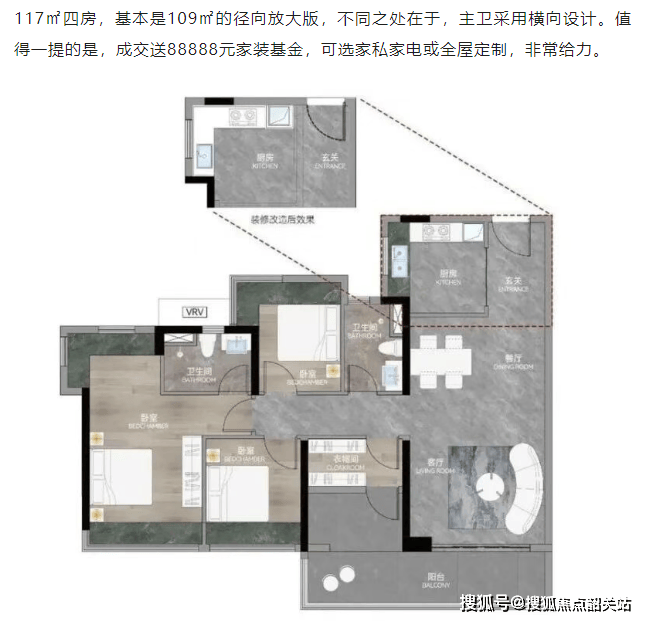 此次加推的悦府1栋主打90-109-117㎡的三四房户型,产品设计新颖,使用率接近100%。其中,90㎡三房户型采用四开间朝南的横厅设计,带独立玄关,阳台连通餐客厅,空间宽敞明亮。109㎡四房户型则采取竖厅设计,客厅、灵动空间、长辈房及主卧均朝南,采光充足。而117㎡四房户型则是109㎡户型的放大版,主卫采用横向设计,增加了空间的灵活性。值得一提的是,成交还赠送88888元家装基金,可选择家私家电或全屋定制,极具吸引力。