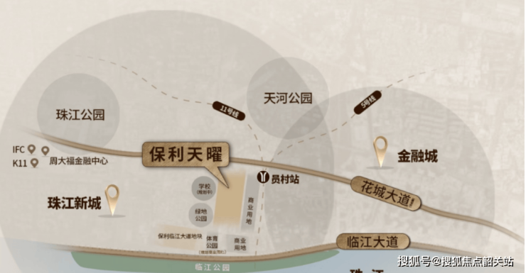 保利·天曜地处广州天河金融城西区,位于花城大道南侧,临近珠江新城CBD核心区,地理区位极其优越。周边路网发达,黄埔大道、临江大道、科韵路等主干道环绕,自驾出行极为高效。公共交通方面,项目距离地铁5号线与规划中的11号线交汇站员村站仅约150米,未来可通过双轨换乘直达珠江新城、琶洲、广州南站等多个重要节点。此外,项目毗邻华南快速干线,对外交通辐射力强,真正实现“半小时生活圈”的都市通勤便利性。