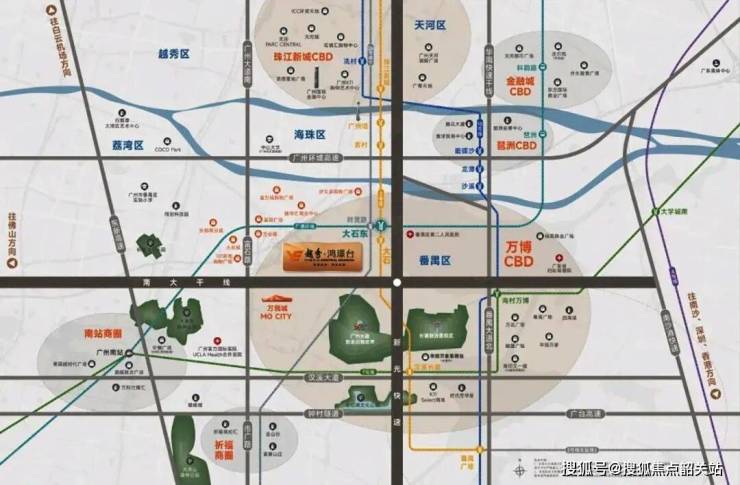 项目位于番禺区大石街南大干线北侧,这里被定义为“广州第三中轴节点”。什么是广州第三中轴线?如果说传统的南北中轴线是广州的历史文脉,那么这条贯穿海珠、番禺的第三中轴线,则是广州未来城市发展的脊梁。它北接珠江新城,南连南沙自贸区,串联起琶洲人工智能与数字经济试验区、万博商务商务区等核心引擎。越秀鸿璟台就伫立在这条发展主轴的关键位置上,享受着辐射全城的发展红利。