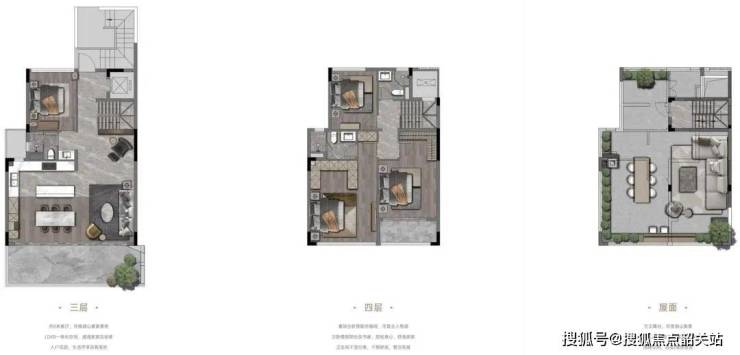 上叠为整栋楼的3-5层,3层主要设置次卧、公卫、客饭厅、厨房等,可以安排长辈居住,避免上下楼不便。