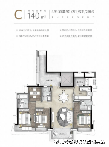 洋房产品: 建面约 140㎡南向园景四房两厅三卫,三卧室朝南,双主套设计,独立电梯入户。