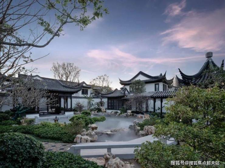 广州院子整体采用新中式建筑风格,外立面以深灰石材、仿木格栅与白墙为主调,屋顶挑檐借鉴岭南传统镬耳屋形制。站在社区入口处,第一眼不会觉得“张扬”,反而有种沉静的秩序感。设计团队显然没堆砌符号化的“国风元素”,而是把礼序、围合、借景这些东方居住哲学,转化成了现代人能用的空间语言。比如楼栋之间保持充足间距,既保障采光,又形成巷道式的归家动线——从大门到自家院门,要穿过几重绿意,节奏慢下来,情绪也自然沉淀。