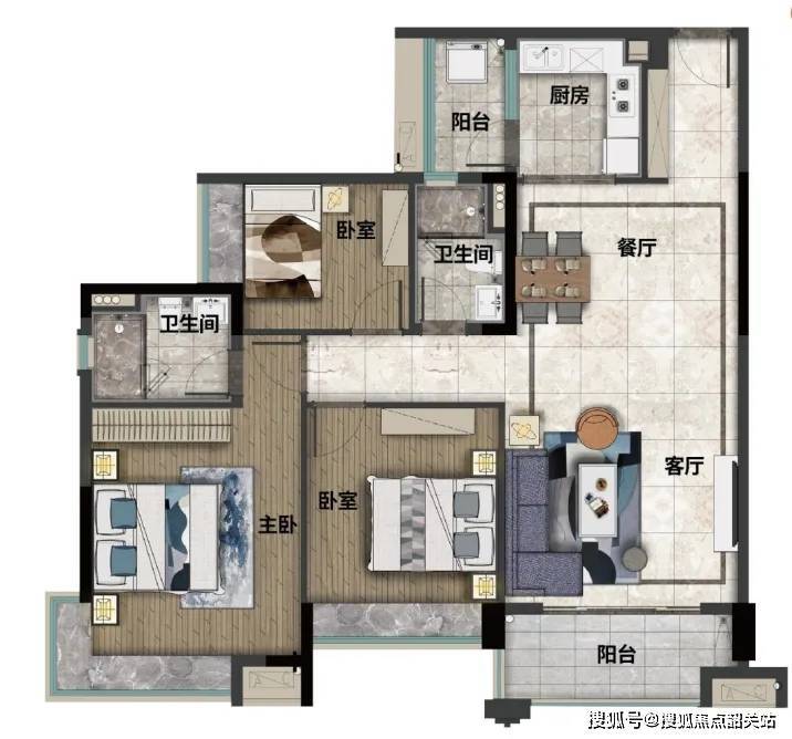 1.精致三房设计一步到位,功能分区明确,动静分离。