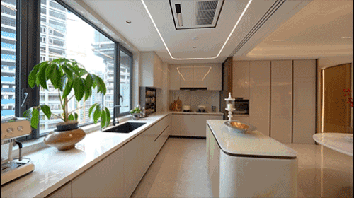 户型格局上,西派天河序十分 “任性”。例如厨房,项目将其开间做到约 5.2 米,远超市场主流的 3 米左右。传统厨房扣除玻璃门后,与餐厅的互动面局促,而西派天河序通过扩大开间,使餐厨真正融合,打造出具有社交属性的互动厨房。此外,在厨房格局设计上,项目摒弃了市场主流的 U 型设计,因为 U 型设计操作台面切分过多,转角位实用性较低。L 型设计则能大大减少碎片空间,将空间利用率推到极致。