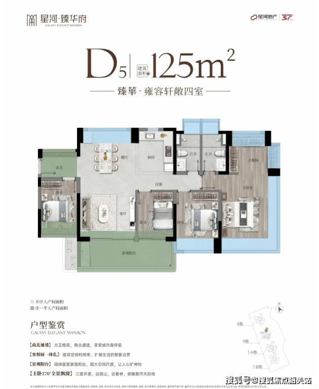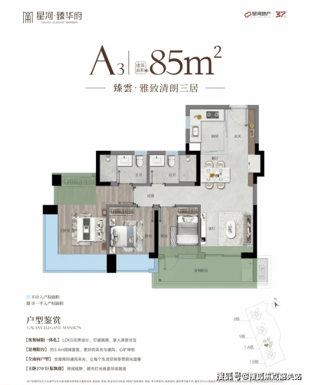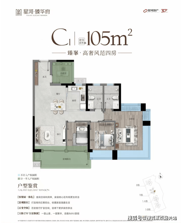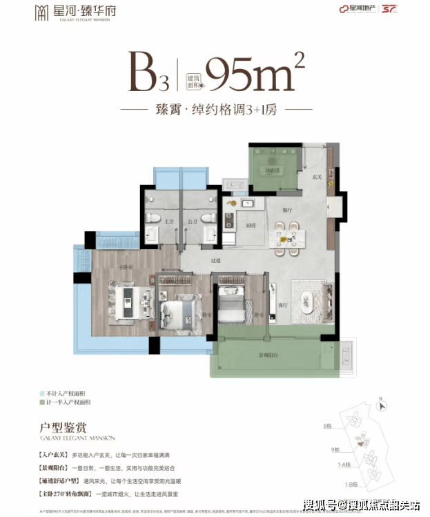 星河臻华府首开推出了9栋和1A栋两栋楼,均为2梯5户的设计,主推建面约85-95-105-125㎡的产品。所有户型设计均以高效的空间利用率为核心理念,使用率接近或达到100%,涵盖约85㎡三房、约95㎡3+1房、约105㎡四房以及约125㎡四房等多种户型选择。特别值得一提的是,这些户型设计考虑到了朝向问题,确保每一户都能享受到充足的阳光。