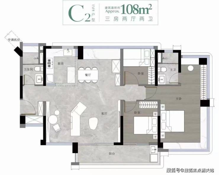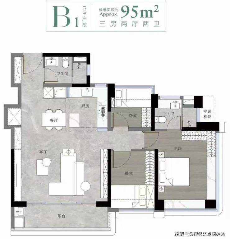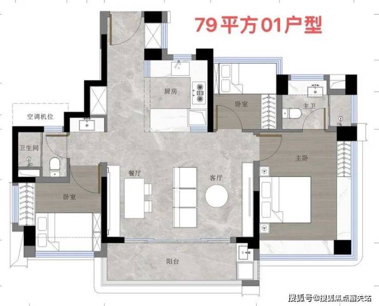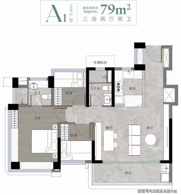 79方的A2户型,3房2卫,一样有5.3米面宽阔景阳台,以及270°大飘窗主卧。这个是飞机户型。