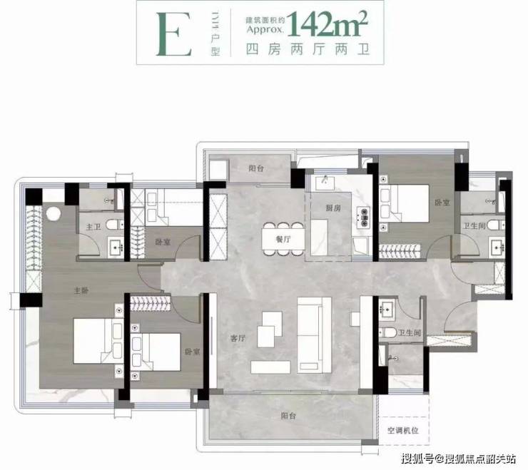建面约142㎡户型,标准的横厅布局,双主套,南北双阳台,南向大面宽,户型没啥缺点。