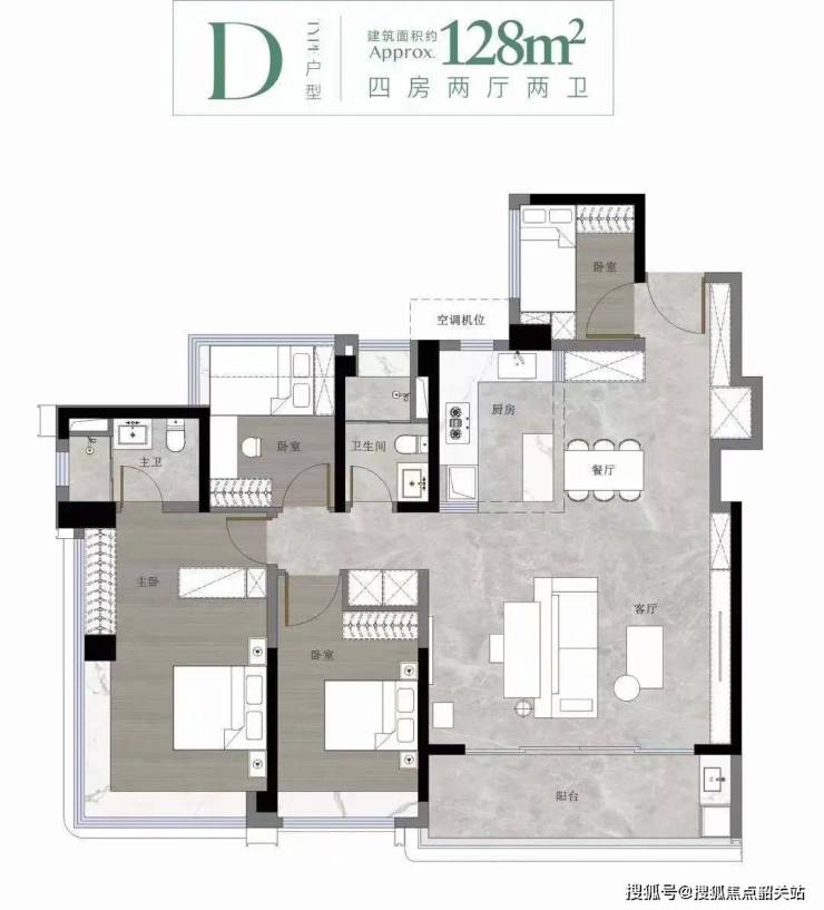 128㎡户型在入户处送了个阳台,做到了4+1房,即便是三孩家庭,在确保每个孩子都有自己房间的同时,也能多出一个房间以备不时之需。