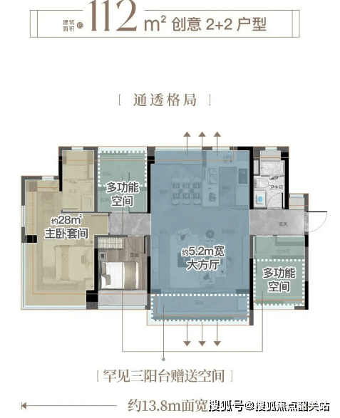 该户型采用南北通透的设计,通风采光极佳。客厅与餐厅一体化设计,连接景观阳台,视野开阔,空间感十足。主卧套房设计,配备独立卫浴和衣帽间,保障居住的私密性和舒适性。以下是该户型图(此处可插入户型图)。