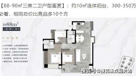 88-90㎡三房二卫:带有约10平方米连体阳台,增加了居住舒适度。