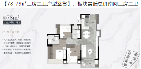 78-79㎡三房二卫:适合小家庭居住,总价较低,性价比高。