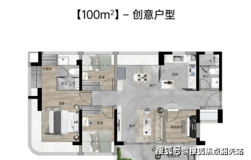 100㎡四房两厅两卫:西南向,使用率109%,南北通透,约6.1米巨幕阳台,主卧270°主卧弧形玻璃幕窗。