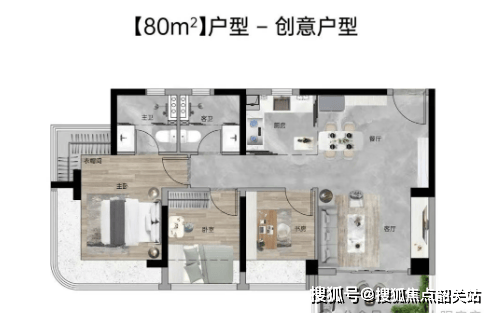 80㎡三房两厅两卫:东南向,使用率高达107%,四开间南向,12.6米超大面宽,主卧270°弧形玻璃幕窗。