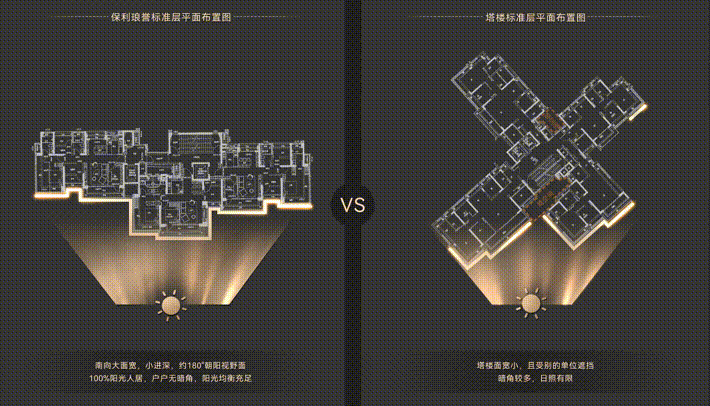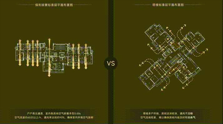 保利琅誉,户户坐北朝南,实现真正意义上的南北对流,确保室内环境空气清新。而塔楼多户环绕,房间进深较深,通风不流畅,空气流线较差,难以确保房间内及时有效换气。