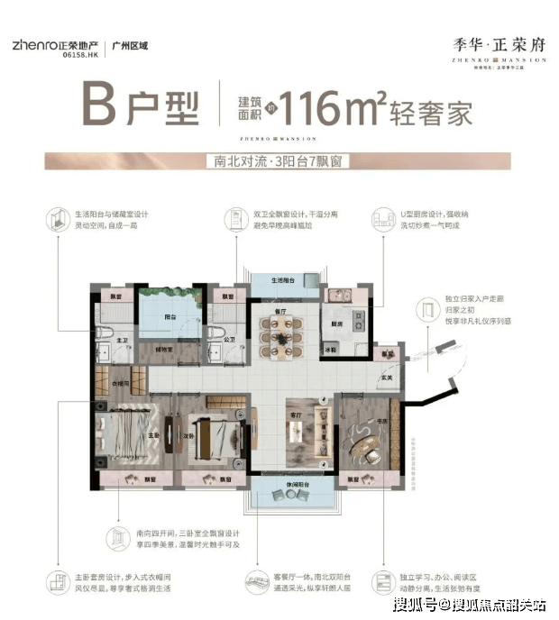 值得一提的是,2026年佛山出台《关于推进“好房子”建设的实施指引》,取消对单个阳台的进深和面积限制,套内阳台的“折半”计容面积上限由套内建筑面积的18%提高至20%,取消凸(飘)窗窗台与地面高差小于0.45米需计容的要求[5]。季华·正荣府的户型设计恰好契合这一政策利好,大量采用阳台、飘窗设计,不仅提升了户型的使用率,更增加了居住空间的延展性,让业主能够获得更多实用空间,真正实现“买得值、住得舒”。