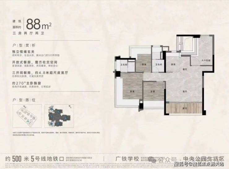 项目加推“中央公园”,紧邻大脚印公园,距离地铁约500米,紧邻学校、酒店,户型涵盖75-88㎡三房,105、125、142㎡四房。