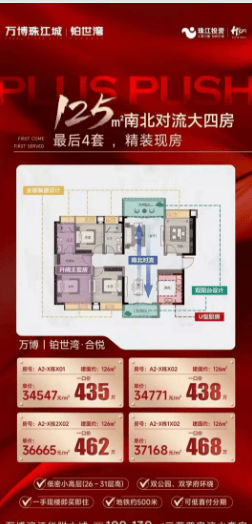 珠江铂世湾主打建面约105-125㎡三至四房,均为现楼产品,清货热销中,所有户型均为三梯四户、全南向/南北对流设计,户型设计经过国内外顶尖设计团队的精心打磨,遵循“江景视野、全明通透、实用至上、人性化设计”的核心原则,打造“南向大面宽、LDK一体化、全明通透、主卧套房、阔景阳台、高得房率”的江岸居住体验,满足不同改善型家庭的多元化居住需求,无论是三口之家、四口之家、二孩家庭,都能找到适合自己的理想户型,每一套户型都彰显着江岸人居的品质与品味。本次重点抢先看清货爆款——建面约125㎡南北对流四房两厅两卫,该户型为项目明星户型,南北对流、全明采光、江景视野,精准匹配改善型家庭的居住需求,现楼清货、臻席递减。