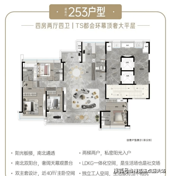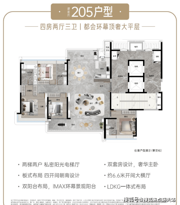 建面约205㎡奢适四房:中轴园林上,环幕景观楼王,双主卧套房设计。